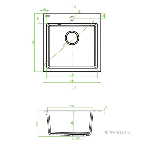 Alena - chiuvetă de granit, neagra, sifon inclus, cu 1 cuvă, forma patrata, SBA 710T