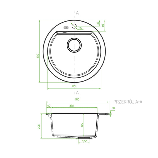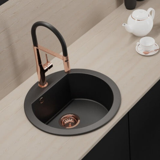 Dafne - chiuvetă rotunda, neagra, cu 1 cuvă fără uscător, sifon inclus, SBD 780T